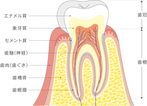 歯を支える歯ぐき(歯肉)や骨(歯槽骨)が壊されていく病気です。歯肉の内側はたくさんの歯周組織により歯は支えられています。歯の表面にあるセメント質と歯槽骨との間に歯根膜という線維が存在し歯が骨から抜けないようにしっかりと支えています。むし歯は歯そのものが壊されていく病気ですが、歯周病はこれらの組織が壊され、最後には歯が抜け落ちてしまう病気です。日本人の40歳以上の役8割がこの病気になる危険性を高めることから、生活習慣病の一つとも言われています。