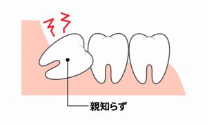顎の大きさによって、親知らずが、お口の中でまっすぐに生えることができない方がいらっしゃいます。その場合、歯の頭を横にして、前の歯を押すように、半分歯茎の下に隠れた状態で生えていることが多いです。