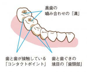 また、これらの他に、「歯並びが悪くて重なっている場所」や「抜けた歯のまわり」なども歯垢がたまりやすい場所です。