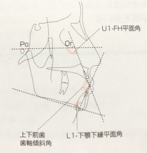 前歯が平均と比べて、前に傾いているのかor内側に倒れているのか角度を測ります。