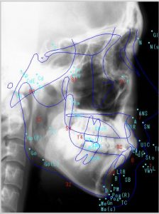 セファロレントゲン上で、様々な角度や長さを計測し、正常な場合の数値と比較していきます。