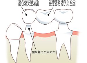 歯を補う部分の両隣の歯を大きく削って作る被せものになります。