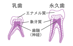 乳歯のエナメル質は、永久歯よりも未成熟だからです。また、乳歯のエナメル質と象牙質は永久歯の半分の厚みしかないことから、進行速度も比較的速くなっているのです。
