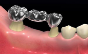 金属の金具で歯に固定させて使う取り外し式の人工の歯です。比較的短期間で治療できます。取り外して歯磨きできるので、ブリッジよりお口の中を清潔に保てますが、どうしても安定性に欠けることもあります。慣れないうちは異物感・違和感がかなりあります。