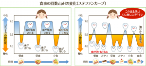 ★私たちが食事をするたびに、口の中のpHは酸性になります。すると歯のミネラルが溶け出し、虫歯になりやすい状態となります。それでも食後しばらくすると、唾液の働きによってpHは元に戻り、歯から失われたミネラルも歯に戻って健康な状態が保たれます。間食が多い人に虫歯が多い1つの原因は、間食が少ない人より口の中が酸性になる頻度が高いからと言われています。