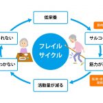 加齢などにより筋力や筋肉量が減少すると活動量が減り、エネルギー消費量が低下します。さらにその状態では食欲が湧かないので、食事の摂取量が減り、タンパク質をはじめとした栄養の摂取不足による低栄養の状態になります。低栄養の状態が続くと体重が減少し、筋力や筋肉量が減少していきます。こうした悪循環をフレイル・サイクルと呼びます