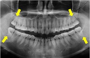 また、横向きに生えた親知らずが手前の歯を押し、根っこが溶かされてしまうことがあります。