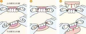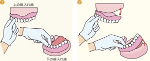 通常は上の顎の入れ歯から入れます。前歯をつまみ、回転させるようにして入れます。上顎用はきちんと入ったら最後に上あごの真ん中を指で押して吸盤のように密着させます。