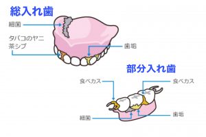「総入れ歯」で汚れがつきやすいのは歯と歯のすき間や歯肉と密着する裏側。「部分入れ歯」は複雑な形をしていて汚れがつきやすいので、金具の部分まで念入りに洗いましょう!