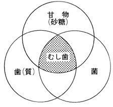 図のように虫歯は、①歯(質)②虫歯原因菌③飲食物に含められる砂糖が一緒になった時に、ミュータンス菌等の虫歯菌が酸を作り、その酸によって歯が溶けてしまうことで虫歯になります。