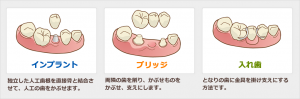 失った歯を取り戻す治療は「インプラント」「ブリッジ」「入れ歯」があります。