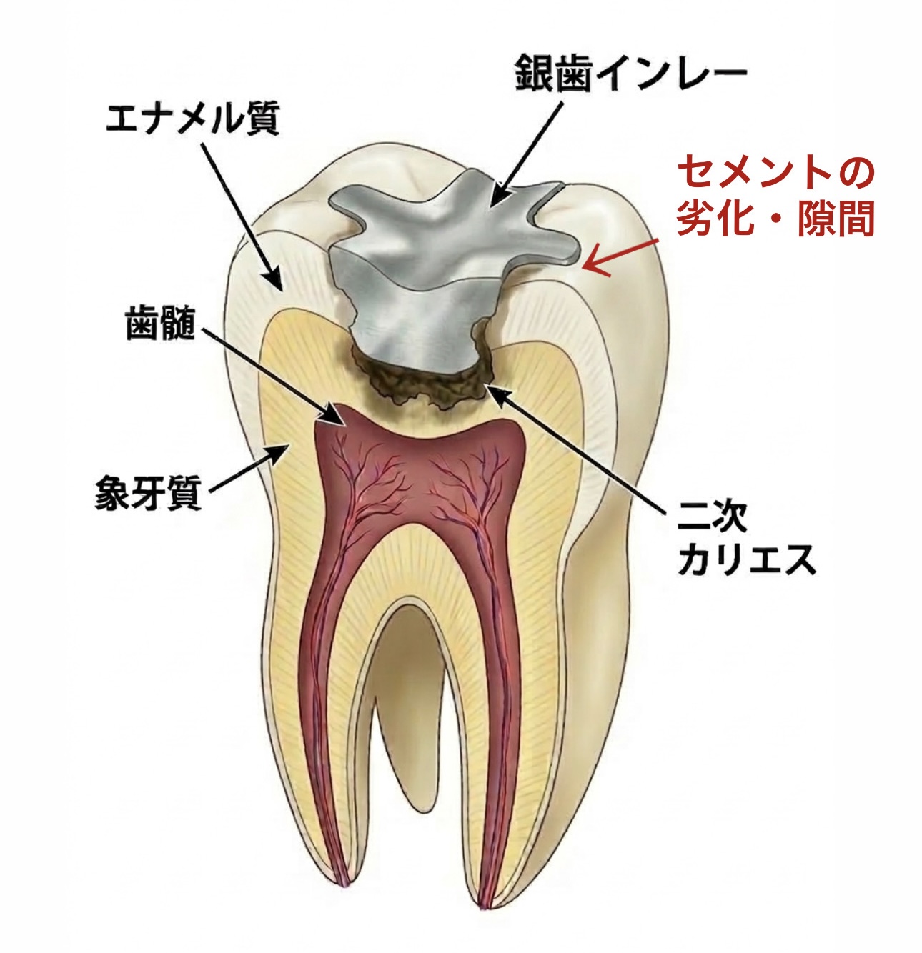 銀歯は時間の経過とともに、接着部分が劣化していきます。