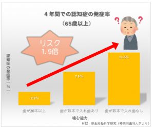 研究の結果、歯が20本以上あるグループと比べて、歯が数本で入れ歯なしのグループでは、なんと認知症の発症リスクが1.9倍にもなることが分かったのです。